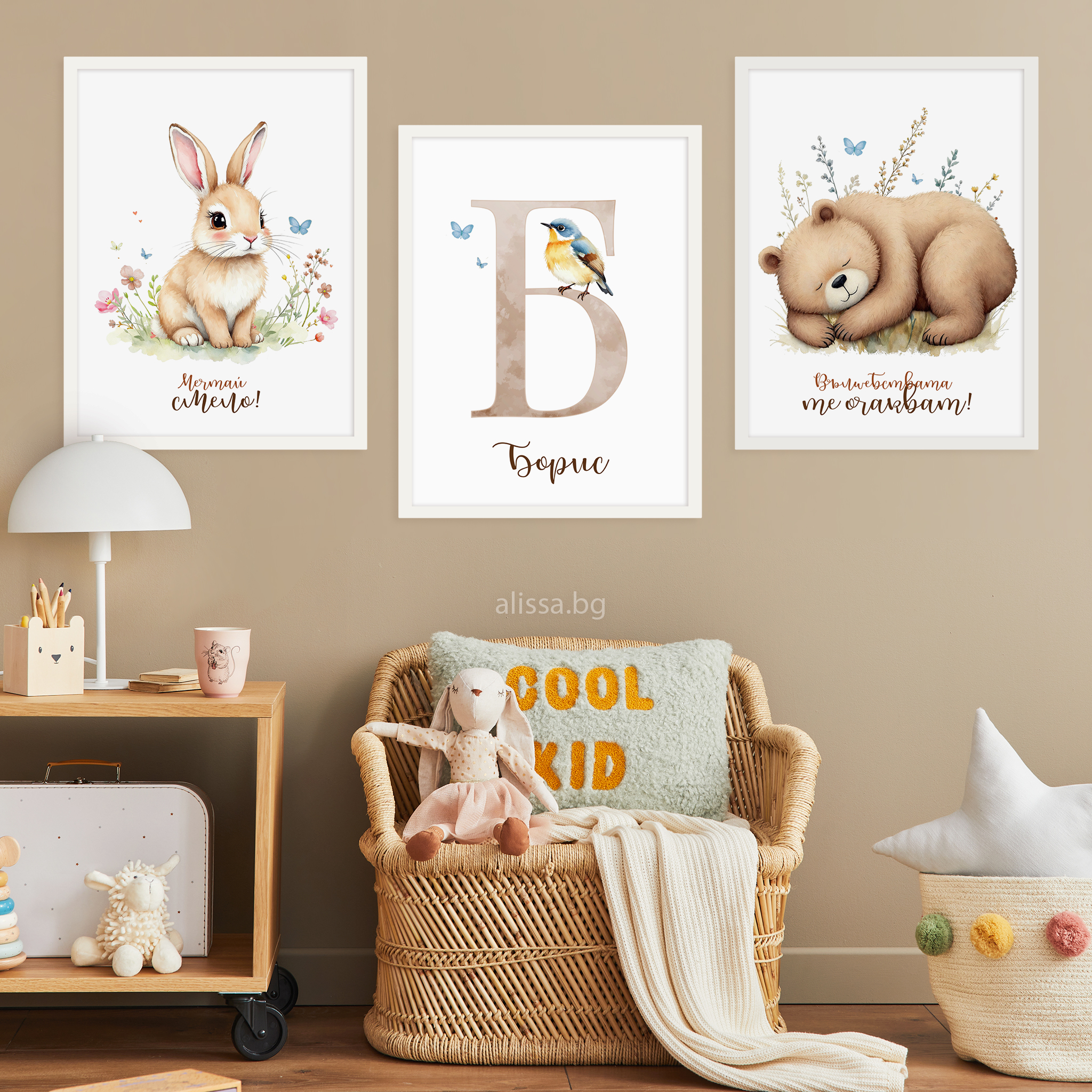 “Горски животни #3-5” е част от серия картини за детска стая с илюстрации, вдъхновени от приказния свят на гората, с емоционални послания и/или името на детето  – красиви цветни принтове на 250 гр бял картон, в размер по твой избор.