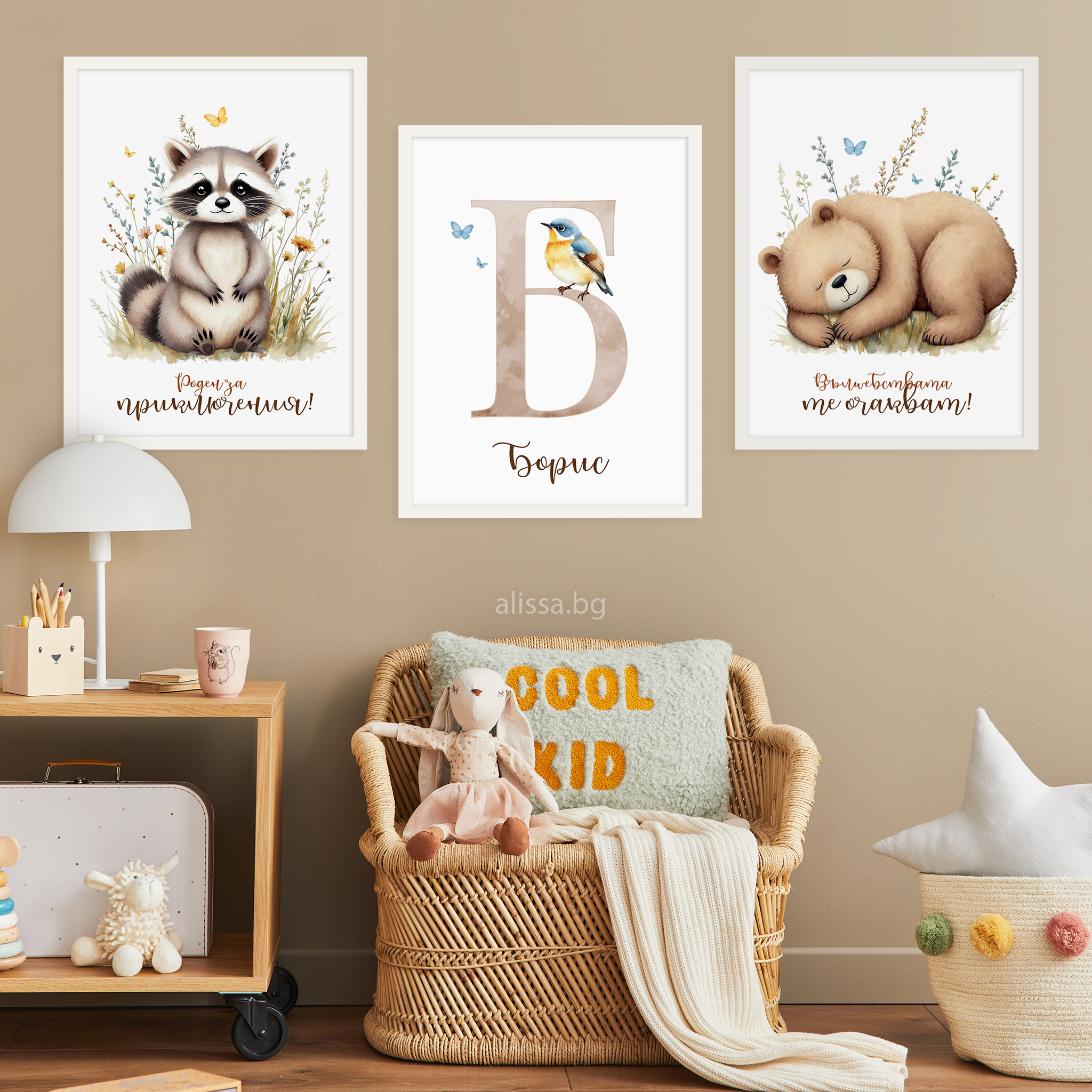 Тази серия картини пренася най-любимите горски обитатели директно в детската стая. Очарователна сърничка прави компания на сладко зайче, Мечо си поспива зимен сън в очакване на нови приключения, а любопитната Лиска и енотът вече се оглеждат за следващата забавна беля.